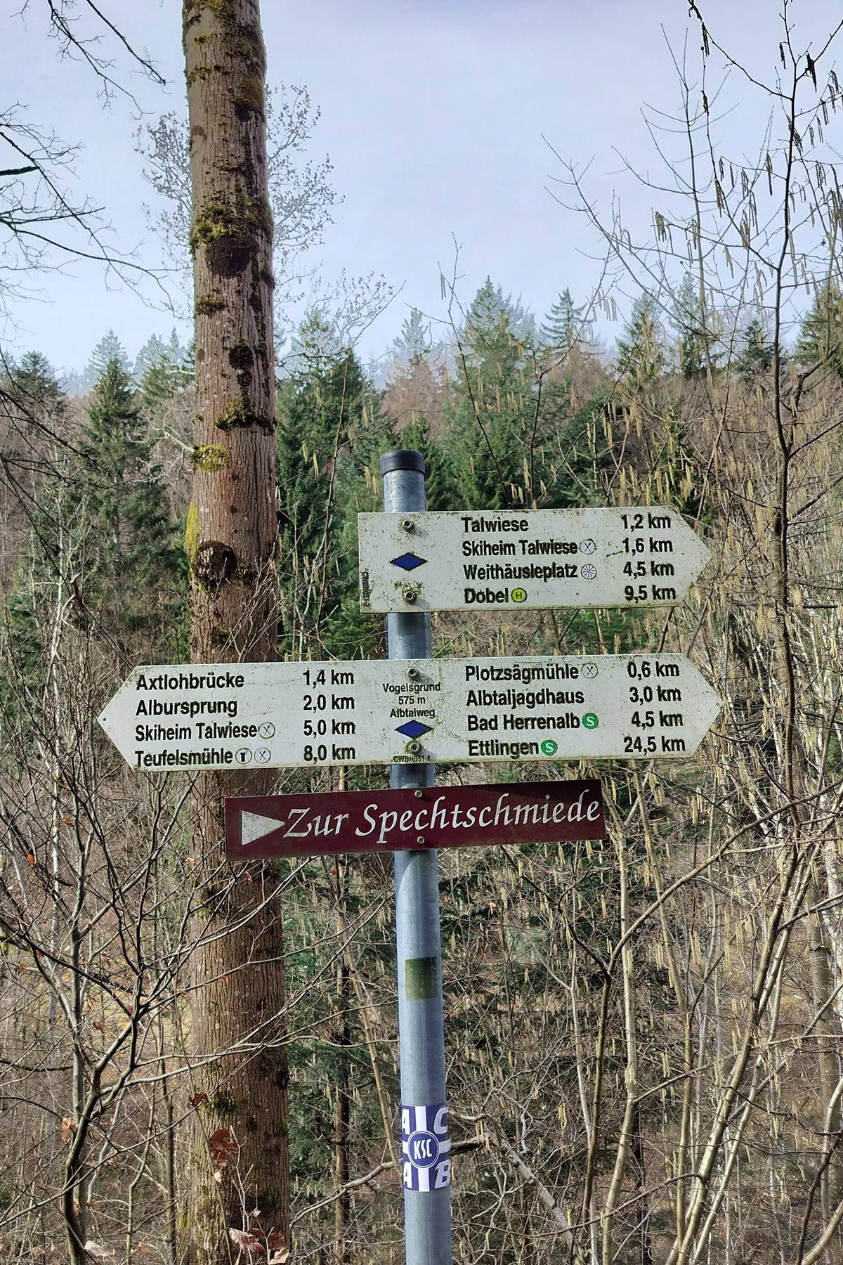 Quer durch die Nadelbäume und über nasses Moos und schlammigen Boden musste ich den steilen Hang, den ich mich hochgetraut hatte, auch wieder hinab. Unten angekommen erwartete mich dann endlich ein befestigter Weg. Ihm gefolgt, sah ich schnell die erste blaue Raute - ein Symbol, das man später häufiger noch sehen wird. Sie symbolisiert den Albtalweg. Ideal also für mein Unterfangen.