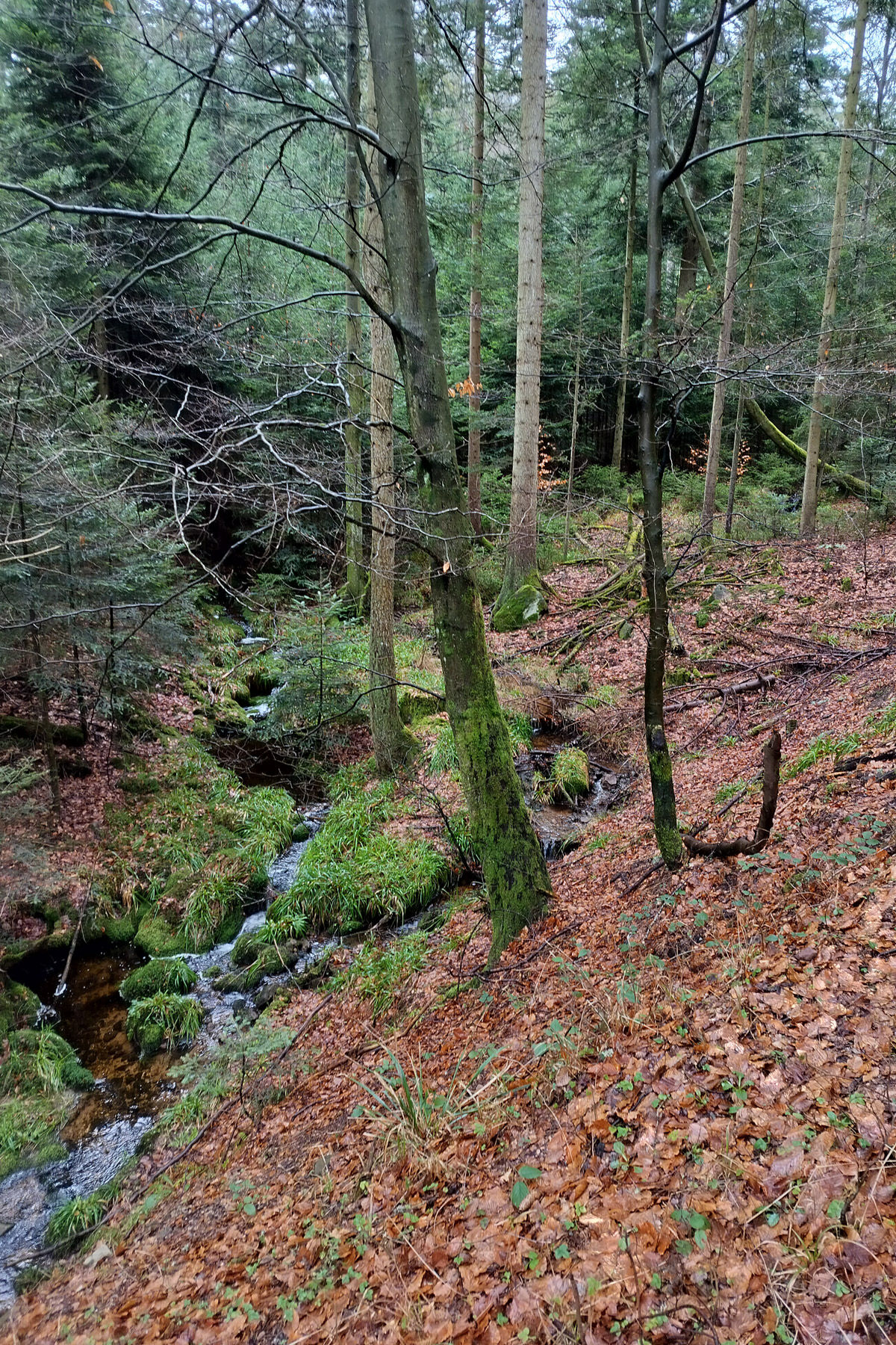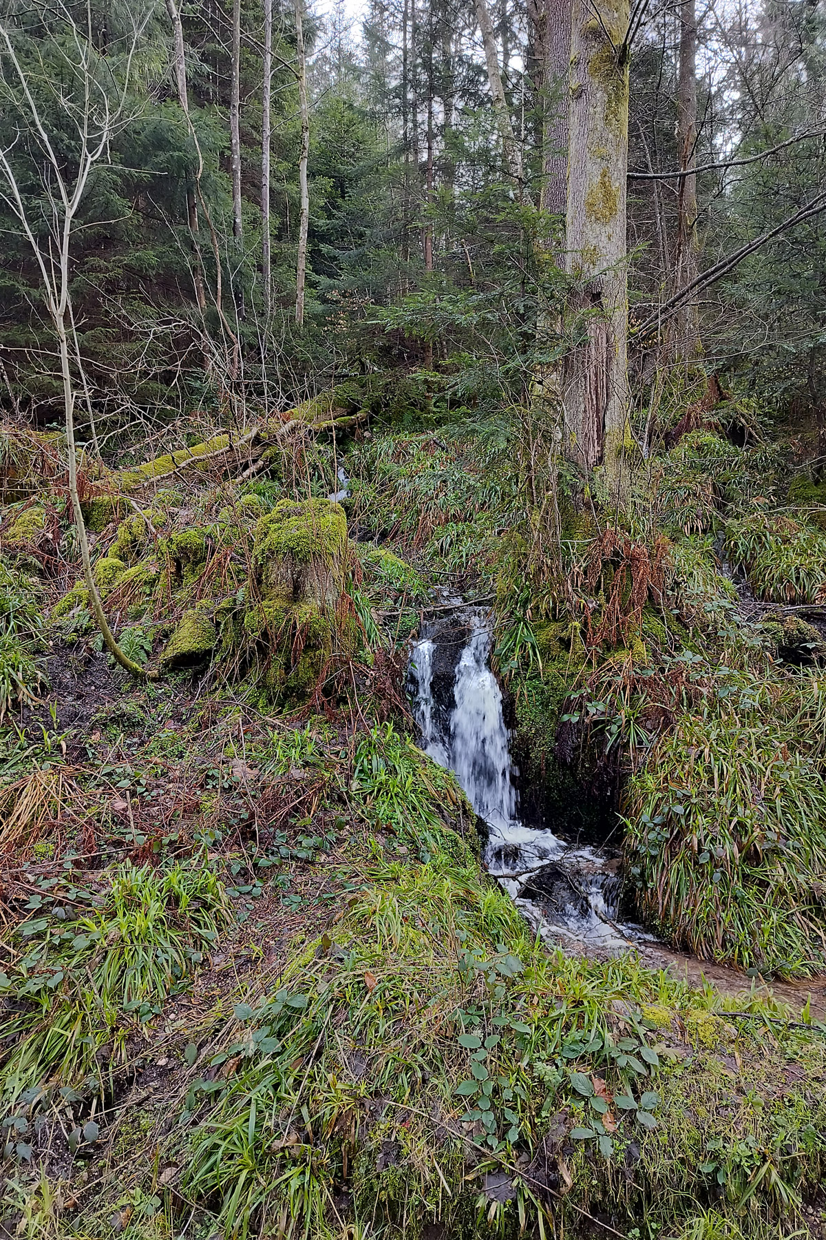 Morgens um 9 Uhr ging es mit der Bahn nach Bad Herrenalb. Von da fuhr ein Bus zur Haltestelle Gaistal Bernbacher Weg und von dort ging es zu Fuß etwa 2 km zur Quelle. Oder zumindest zu dem Hang, an dem die Alb irgendwo entspringt. Die Alb konnte ich erkennen, folgte ihr also auf dem nun unbefestigen Hang zu ihrem Ursprung. Dies stellte sich dann aber schwieriger heraus als gedacht. Ein, zwei oder dreiundzwanzig Schritte ins nasse Moos später hatte ich etwas, was einer Quelle ähnelt, lokalisiert und konnte den Lauf mit durchnässten Schuhen und Socken endlich beginnen.